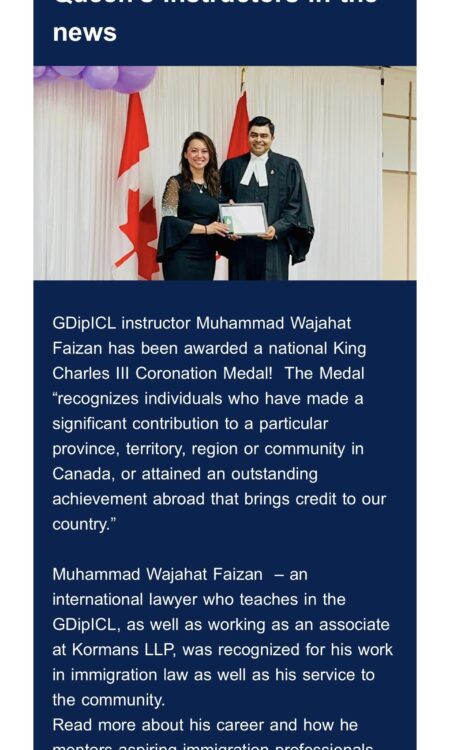 Parallel to his legal practice, Faizan is an educator who has significantly shaped Canada’s immigration law community. As an Adjunct Professor at Queen’s University – Faculty of Law, he teaches in the Graduate Diploma in Immigration and Citizenship Law program, covering Ethics and Professional Responsibility, Immigration Practice Management, and Advanced Legal Issues. Over the years, he has taught at Academy of Learning College and CDI College in Canada, and internationally at The Institute of Legal Studies and Superior Law College in Pakistan under the University of London International Program.