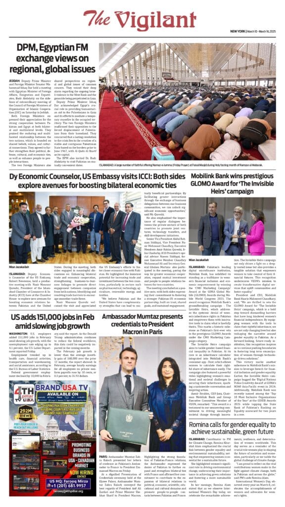 UncategorizedVigilant Epaper: March 10,2025 admin12 months ago12 months ago01 mins Post Views: 4,290 Post navigation Previous: Usman Abbas: A Visionary Leader Bridging Compassion and Community EmpowermentNext: Ali Zai Foundation Hosted Iftar Dinner Leave a Reply Cancel replyYour email address will not be published. Required fields are marked *Comment * Name * Email * Website Save my name, email, and website in this browser for the next time I comment.